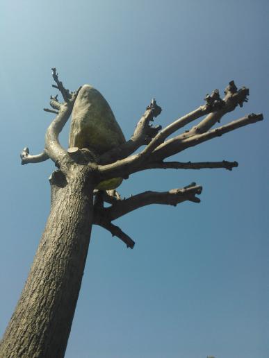 Zentrales Motiv seiner ersten großen Einzelausstellung in Berlin ist der Wald. In der Installation "Forst" nehmen fünf über Kopf aufgehängte und sich langsam drehende Bäume die gesamte, zehn Meter hohe Ausstellungshalle ein.
