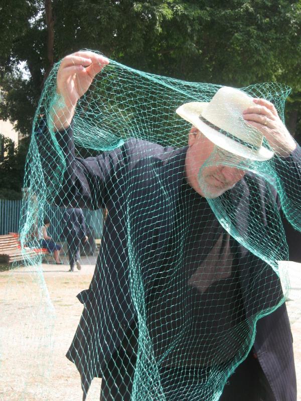 hat am Rande des Sportplatzes hinter der Orangerie im Auepark, Kassel einen Hubwagen mit einem 30 Meter hohen Transparent aufgebaut. Auf einer 10m hohen Grafik wird in Längeneinheiten dargestellt was die ärmsten 20 Prozent der Weltbevölkerung besitzen ca. 1m, die nächsten 20 Prozent Mittelstand reichen bis ca. 2 m hinauf zu den reichsten 19 Prozent 9,99 m . Das eine Prozent der Finanzbosse und Milliardäre kann nur durch den Hubschrauber dargestellt werden. Der fliegt bis auf eine Höhe von 225 Metern. Und das ist auch die Welt , mit und in der sich diese 1%ige Bevölkerung über die Welt bewegt.